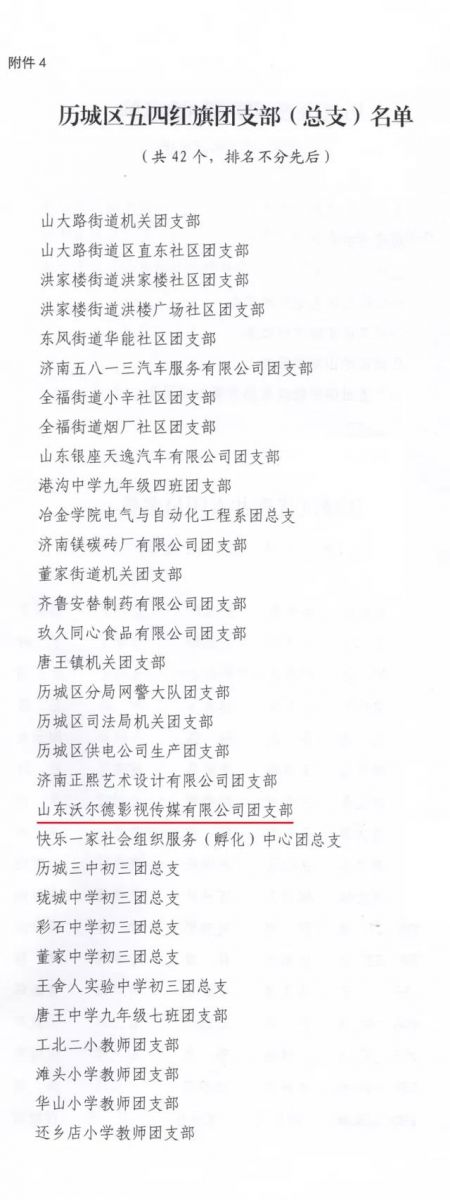 2018年5月11日,共青團(tuán)濟(jì)南市歷城區(qū)十五屆五次全委(擴(kuò)大)會議勝利召開,會上對2017年度在共青團(tuán)工作方面取得優(yōu)秀成績的先進(jìn)集體及先進(jìn)個人進(jìn)行了表彰。沃爾德集團(tuán)團(tuán)委、沃爾德影視公司團(tuán)支部及團(tuán)干部、團(tuán)員、青年志愿者代表榮獲各項榮譽稱號。