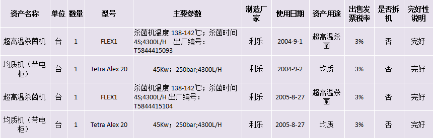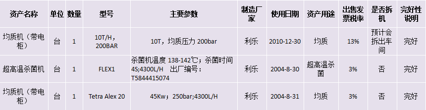 標(biāo)的一:均質(zhì)機(jī)(帶電柜)、超高溫殺菌機(jī)等設(shè)備,起拍價(jià)格:40萬元(含稅,稅率見詳情表),競買保證金8萬元。
