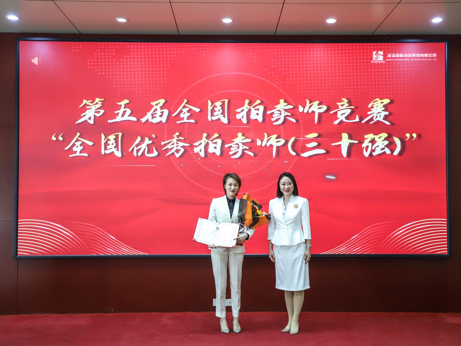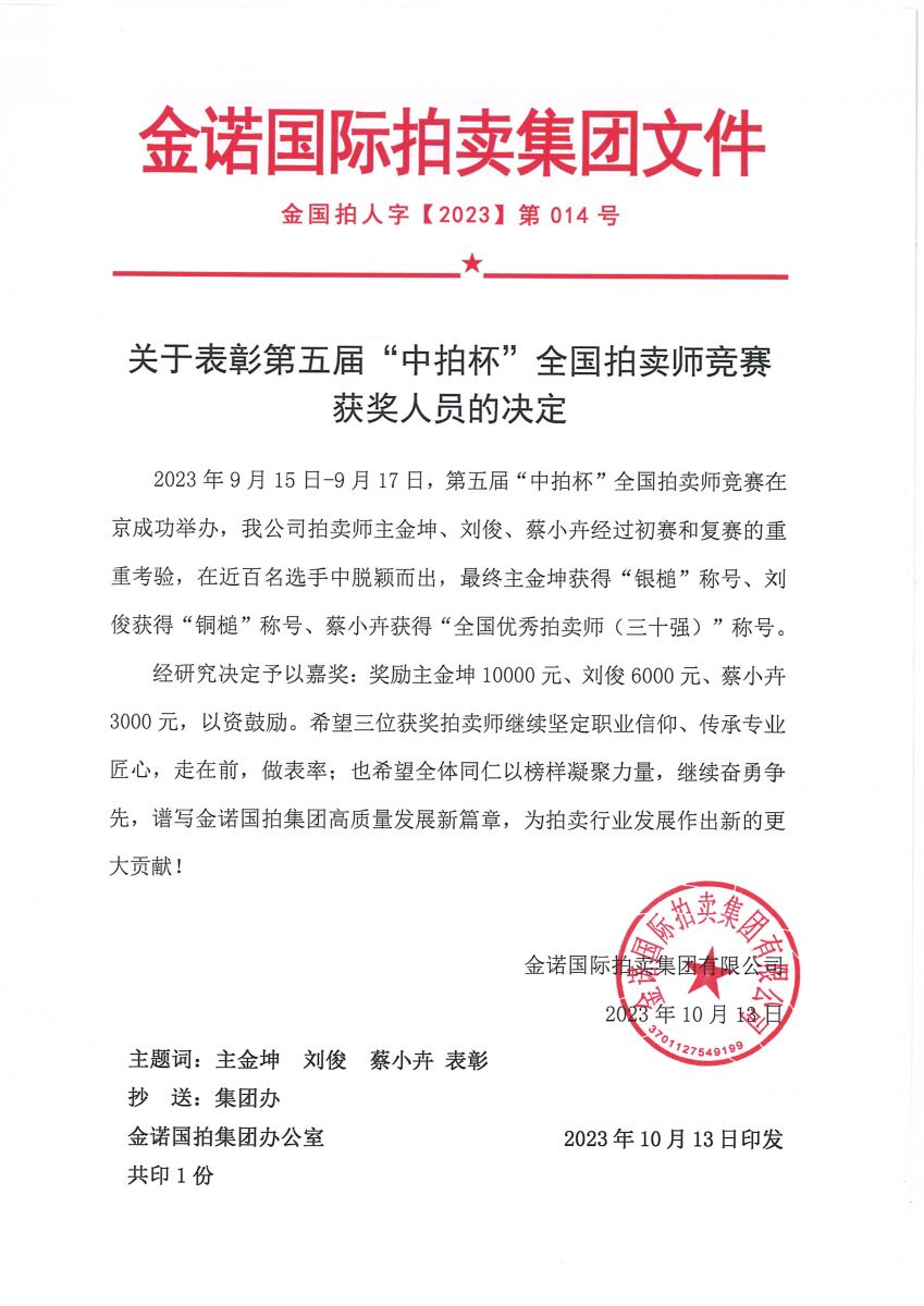 金諾國拍集團總裁位琳首先宣讀了《關于表彰第五屆“中拍杯”全國拍賣師競賽獲獎人員的決定》,“經研究決定予以嘉獎,希望主金坤、劉俊、蔡小卉三位獲獎拍賣師繼續堅定職業信仰、傳承專業匠心,走在前,做表率;也希望全體同仁以榜樣凝聚力量,繼續奮勇爭先,譜寫金諾國拍集團高質量發展新篇章,為拍賣行業發展作出新的更大貢獻!”
